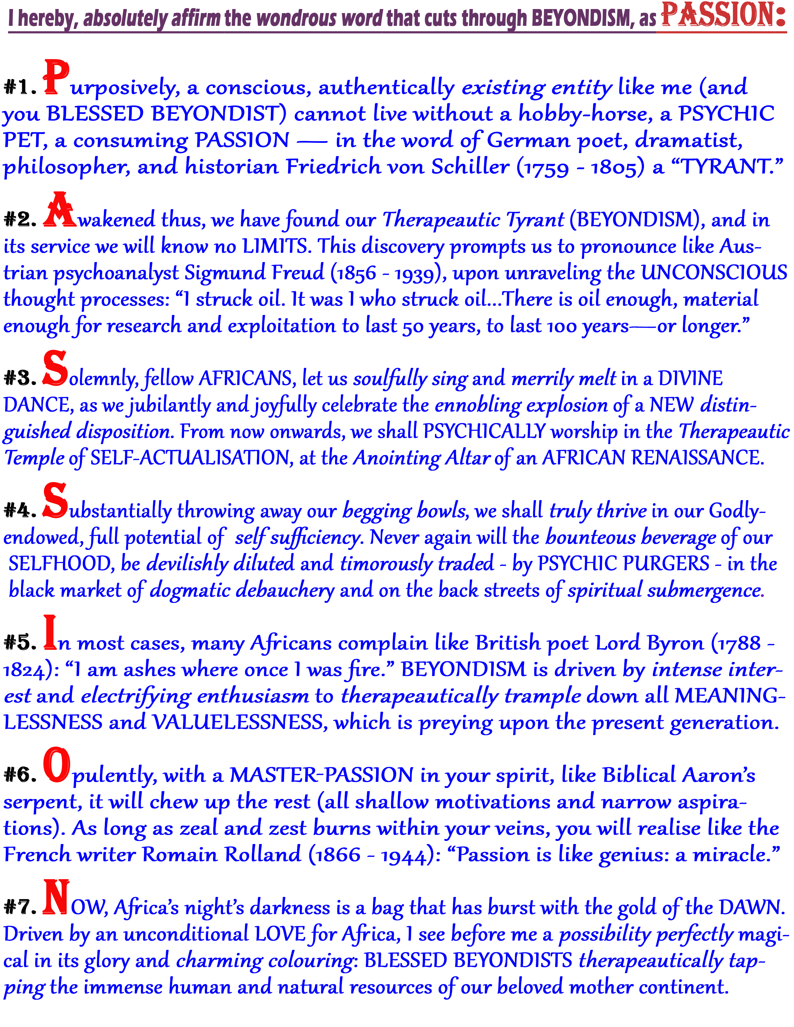 [prompt 1...Left hand palm placed on the chest, Right hand raised with a clenched fist rending the air] Hail BEYONDISM!===>[reply 1...imitating the prompter, but rending the air 3 times] Awakened. Blooming. Creative....... [prompt 2...Left hand clinching the waist, Right hand palm stroking the chest] I AM a Blessed Beyondist (BB)===>[reply 2...imitating the prompter, but stroking the chest 3 times] Which amounts to being The Anointed One (TAO).......[prompt 3...Hands resting on the belly, head slightly bowed] In as much as My ‘BEING’ is in holy harmony with Nature and The SUPREME BEING so WHAT?===>[reply 3...imitating the prompter, but bowing the head 3 times] GOD IS FOR ME. GOD IS IN ME. GOD IS WITH ME. [facing each other, hands lifted up with open palm, slashing the air 7 times] AFRICA. AFRICA. AFRICA! ARISE. ADVANCE. ACHIEVE! AMEN! May you celestially celebrate the 5th BEYONDIST BOMBSHELL!