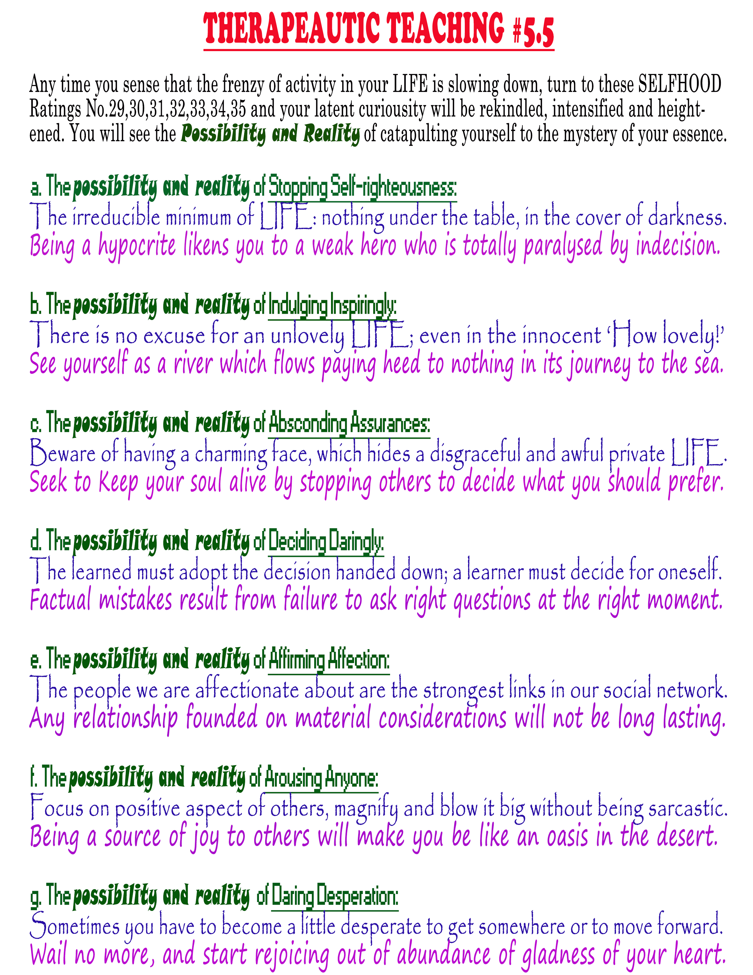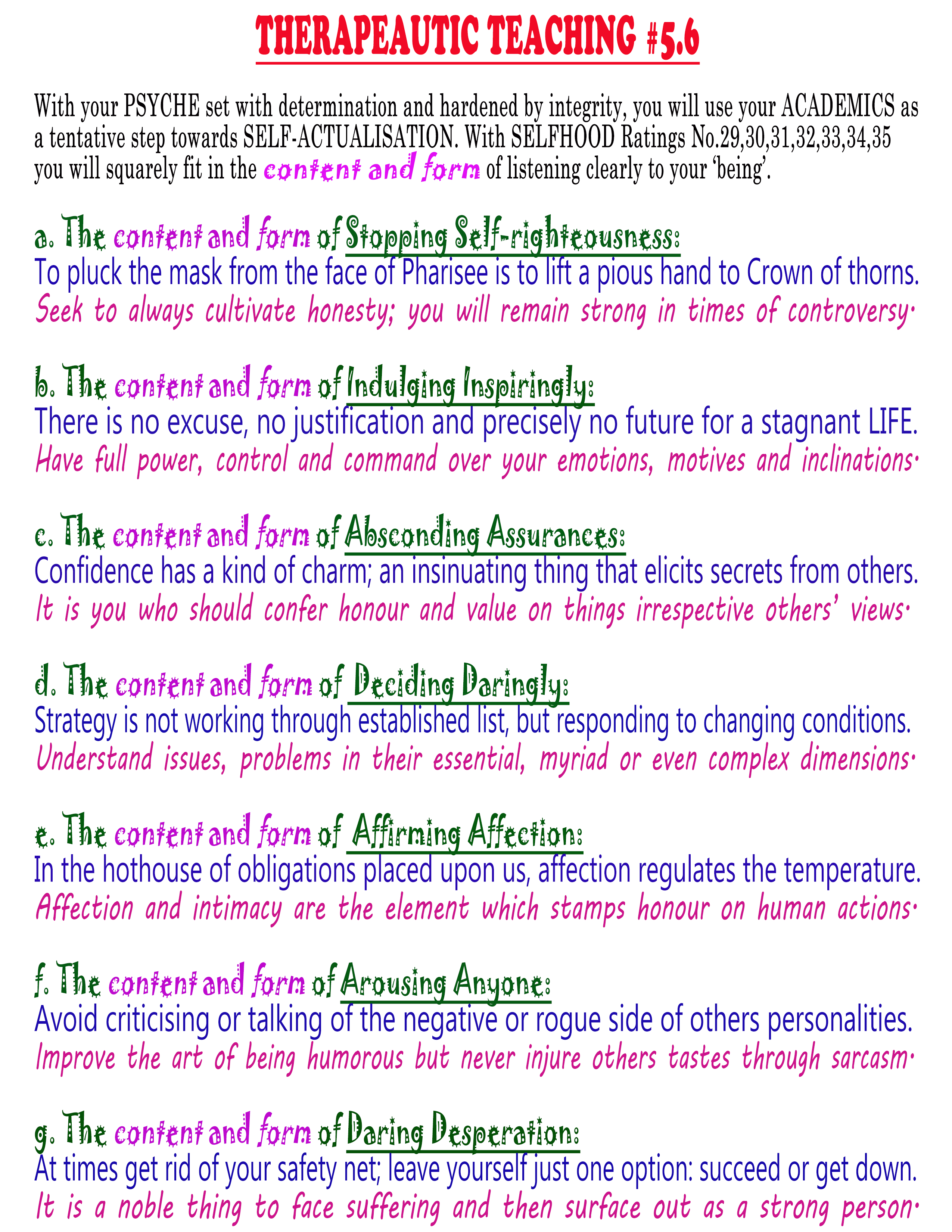 #5.1. PRAY #5.2. BELIEVE Verily, verily, your guiding generalisations and ‘Basic Beliefs’; #5.3. INTERACT #5.4. WORK #5.5. PENETRATE #5.6. LIVE #5.7. ACTUALISE Verily, verily, you are at the citadel of ‘Holistic Humanness’; |