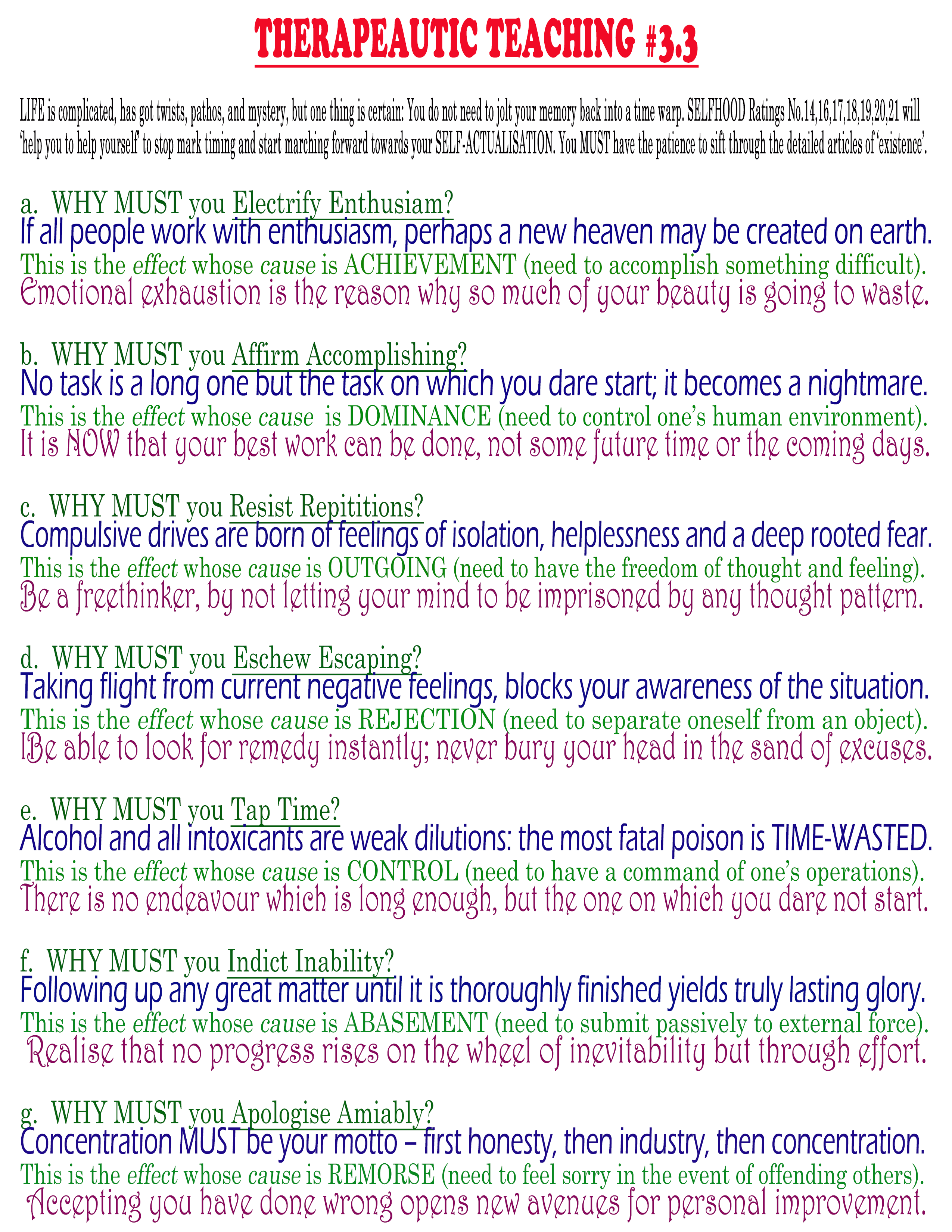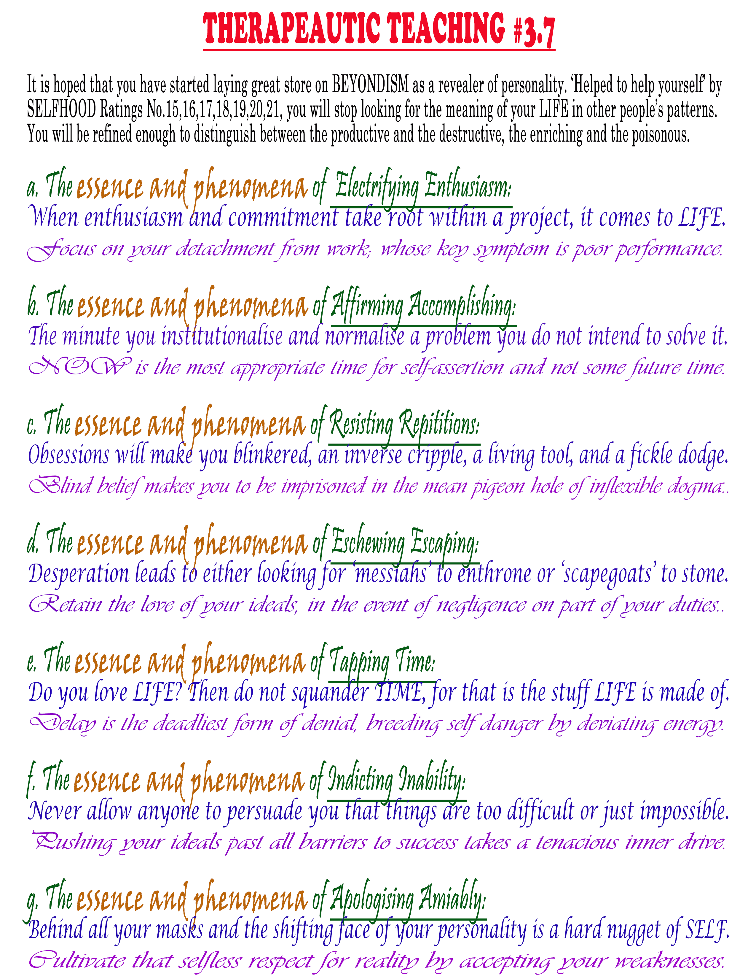 THOROUGHLY TRANSCENDING your ‘Temporary Turmoil’ MUST be your third major ‘Mortal Mission’. This is gorgeously grounded on your distinguished ‘Divine Duty’, to Yearn YES-saying MOTIVATIONS. As an ennobling encouragement to you ......., to ‘dig deep into the wells of your individuality, and to unleash your immense creative abilities’, BEYONDISM reflectively seeks to “PARAPHRASE” your response to the PROMPTINGS (not really questions) No.11, 1.v, 12, 13, 14, 15, 16, 17, 18, 19, 20 & 21 consecutively.The THERAPEAUTIC TARGET here is: To help you to be fully aware and participate in your inner and personal world; to enter the room of your unique skills, and dine at the table of greatness. ---> ![]() |